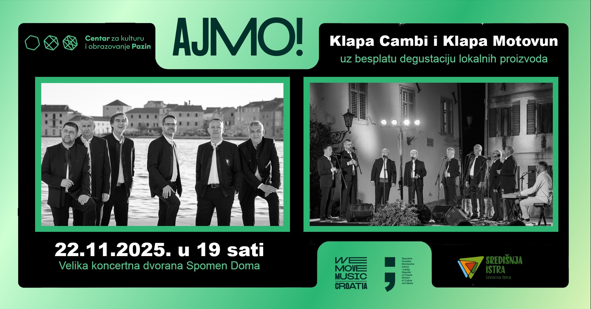 Centar za kulturu i obrazovanje Pazin poziva sve ljubitelje klapske pjesme i domaćih okusa da nam se pridruže u subotu, 22. studenoga 2025. u Spomen domu, gdje ćemo zajedno proslaviti ljepotu glazbe, zajedništva i okusa zavičaja.