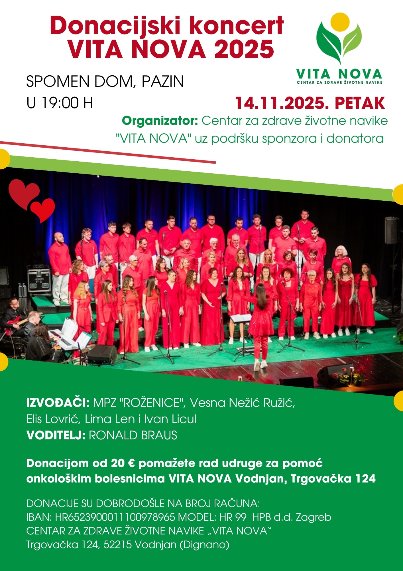 U suradnji s Mješovitim pjevačkim zborom „Roženice“ Pazin, održat će se donacijski koncert „Vita Nova 2025.“.