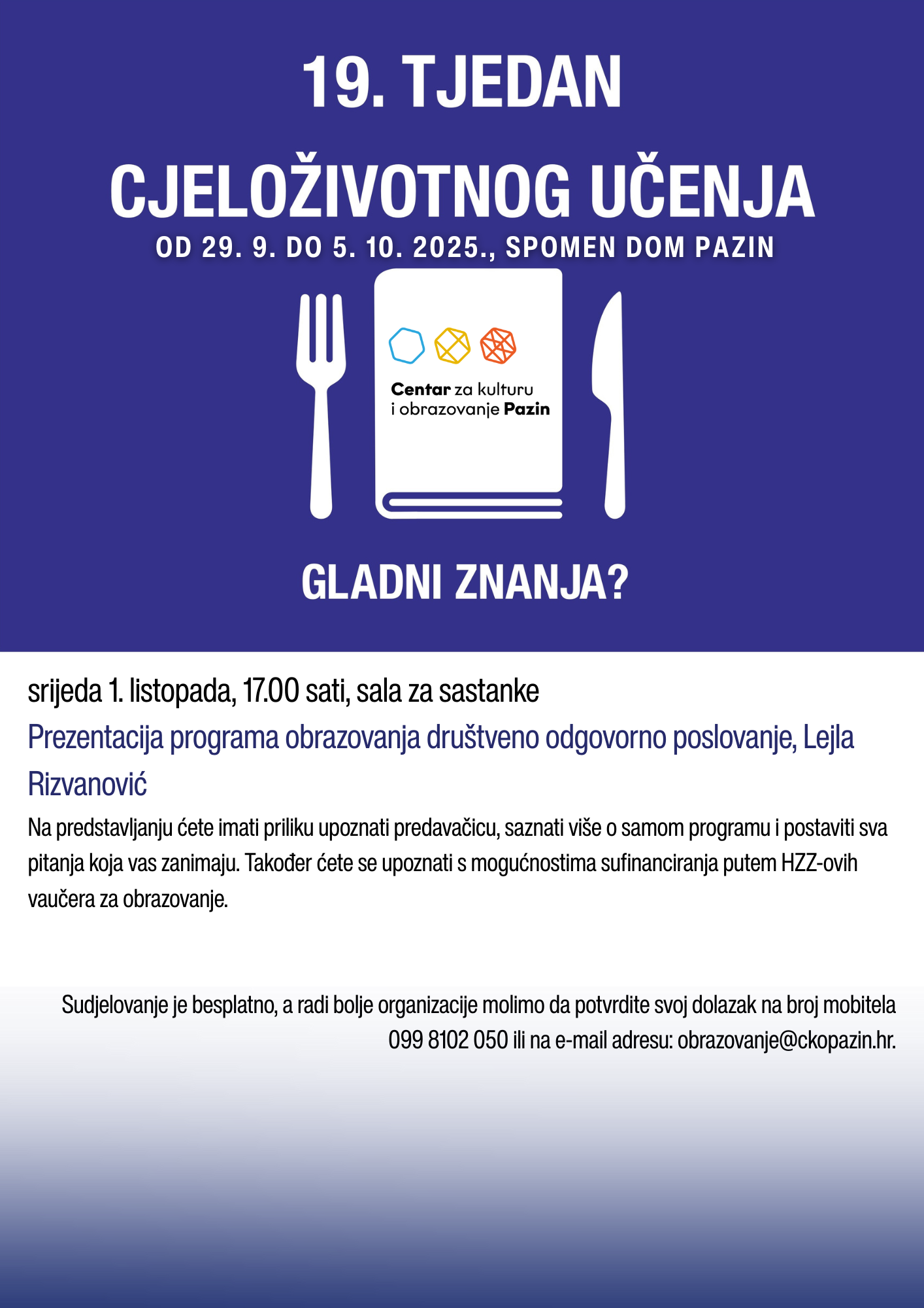 Sudjelovanje je besplatno, a radi bolje organizacije molimo da potvrdite svoj dolazak na broj mobitela 099 8102 050 ili na e-mail adresu: [email protected].